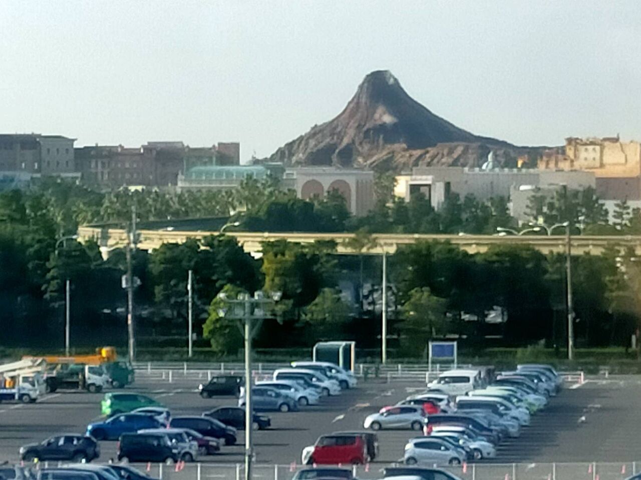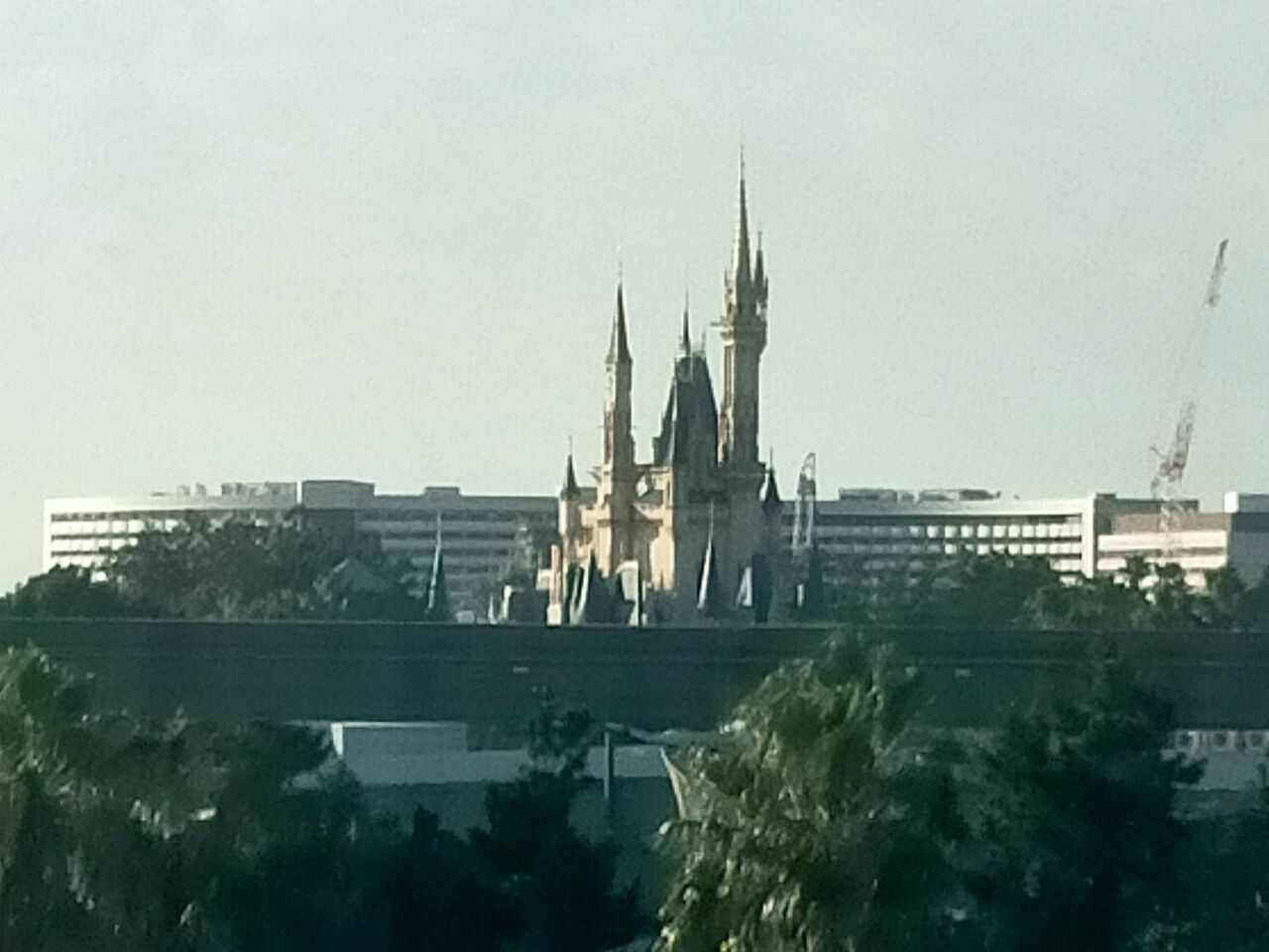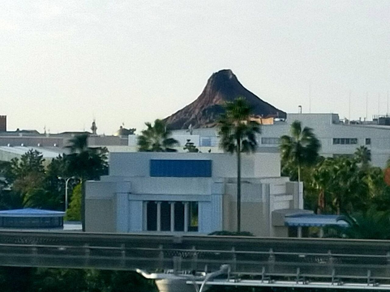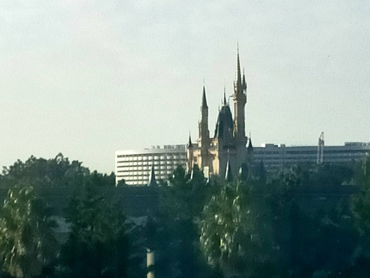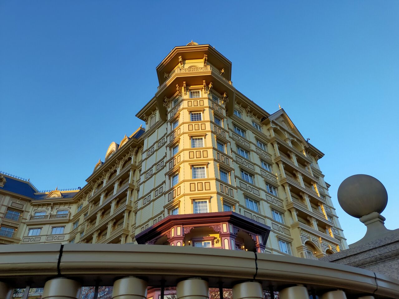 外に出ると夕日に染まるディズニーランドホテル