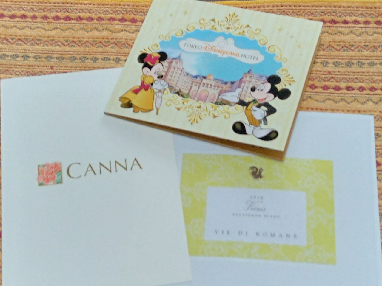 お誕生日祝いのお写真と、ワインのエチケット レストランロゴの入ったメニュー表