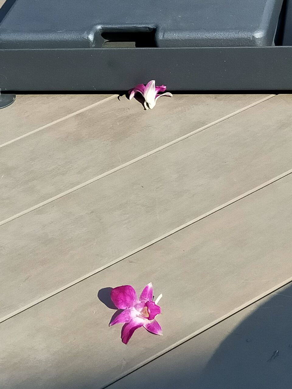 グラスを持ってくる最中に、飾りの花が飛んでしまうくらいの強風。