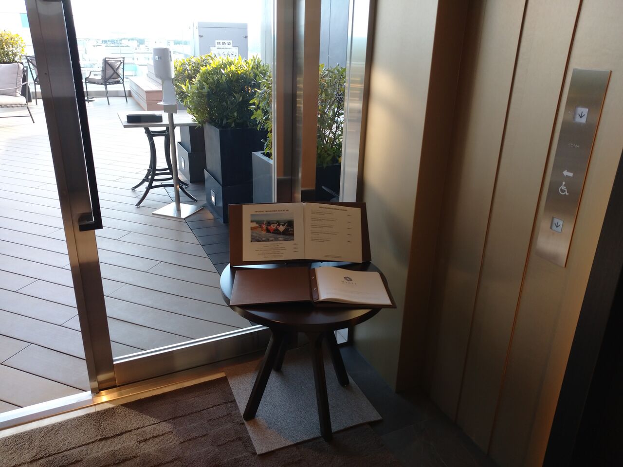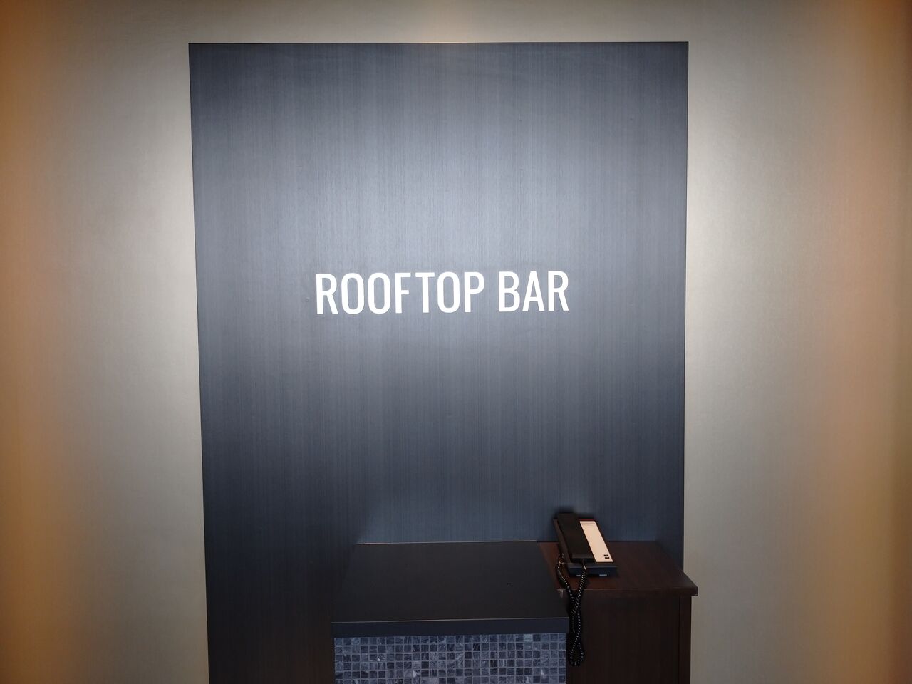 屋上へ行くエレベーター(行かないエレベーターもあるので注意)のドアが開くと正面にルーフトップバーの文字が。