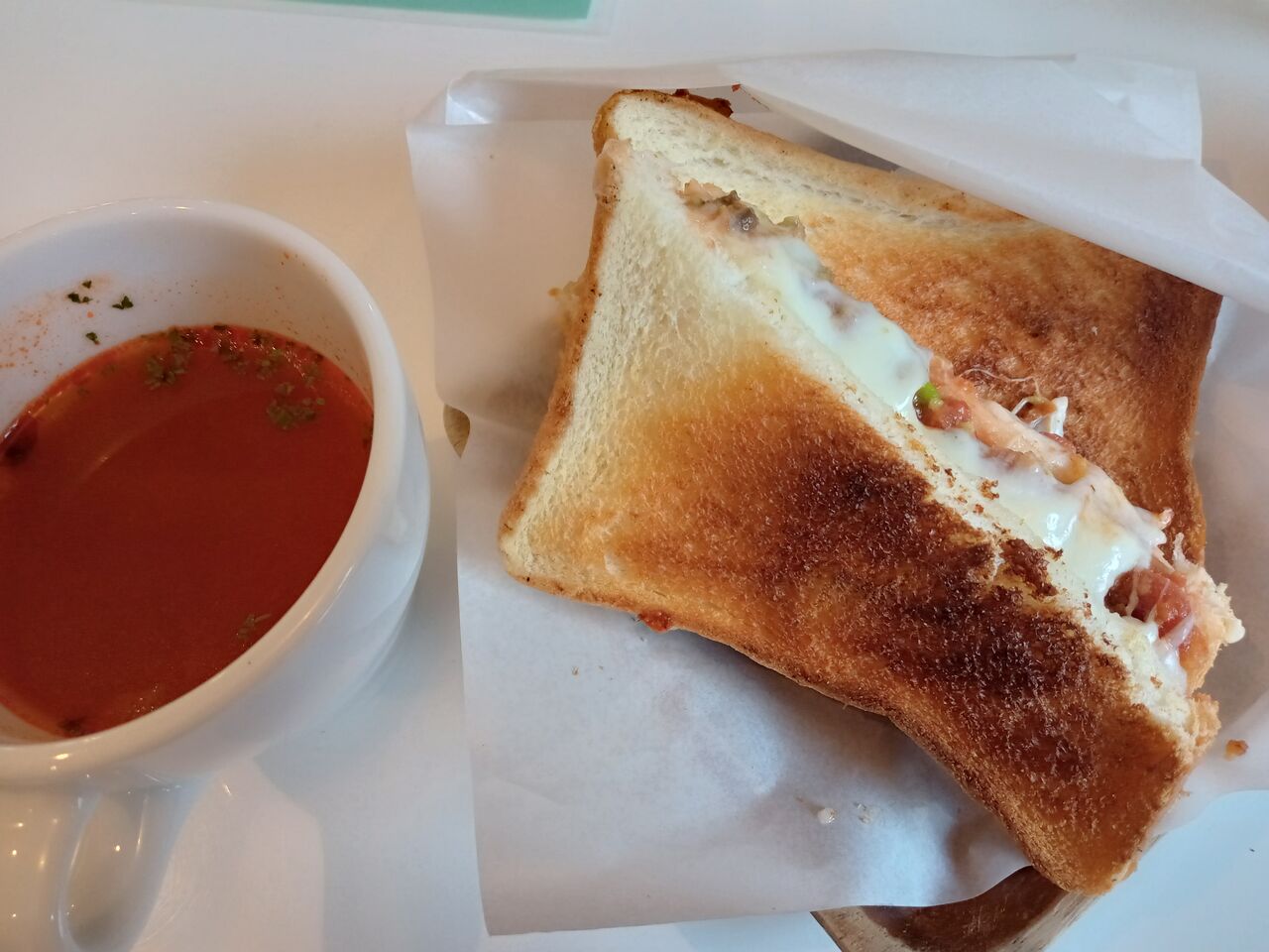 チーズもたっぷりで食べ応えありで美味しい。トマトスープもついてました。
