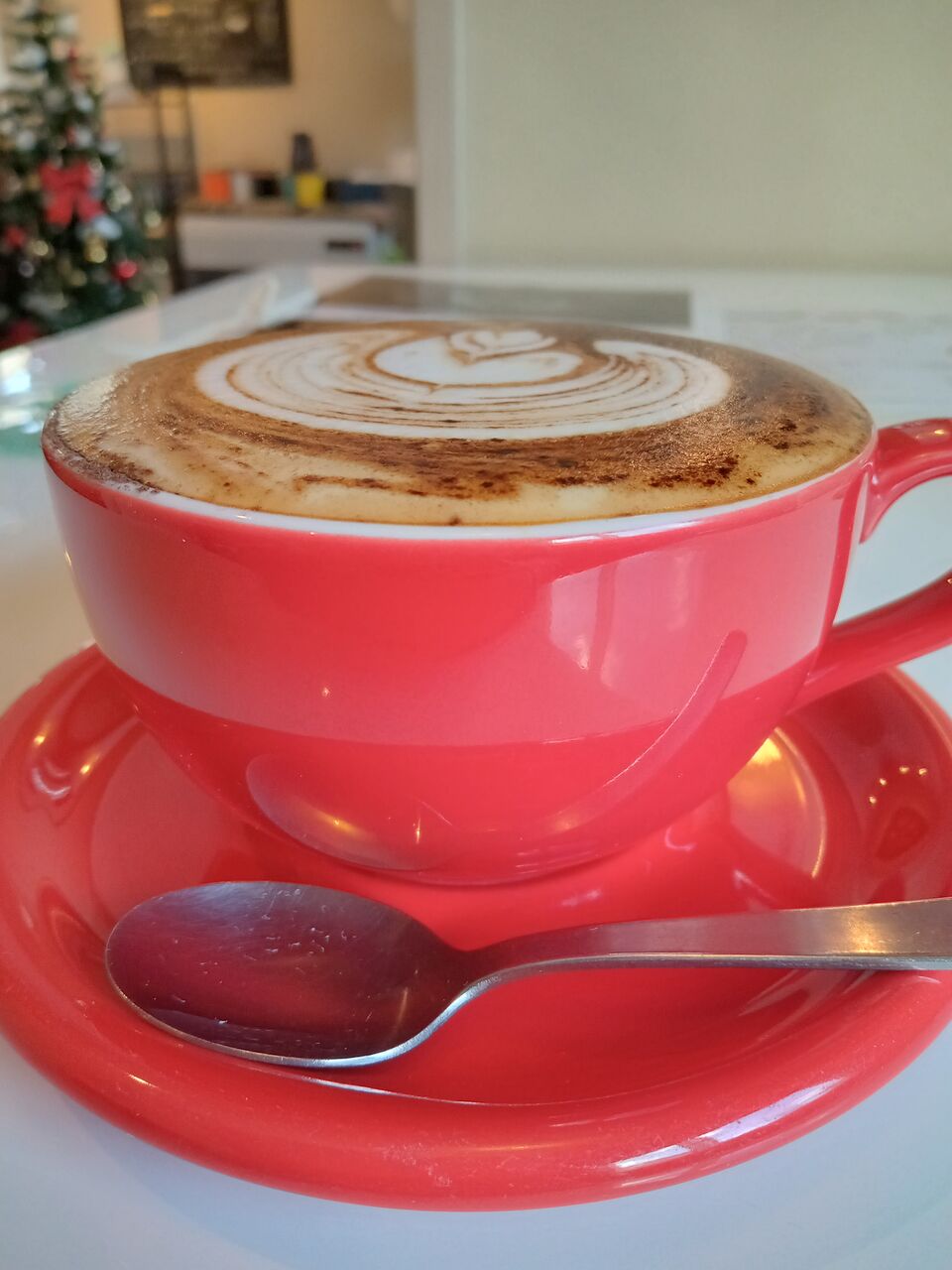 タップリサイズのカップに、盛り上がるくらいのフォームが入ったカフェラテ。
