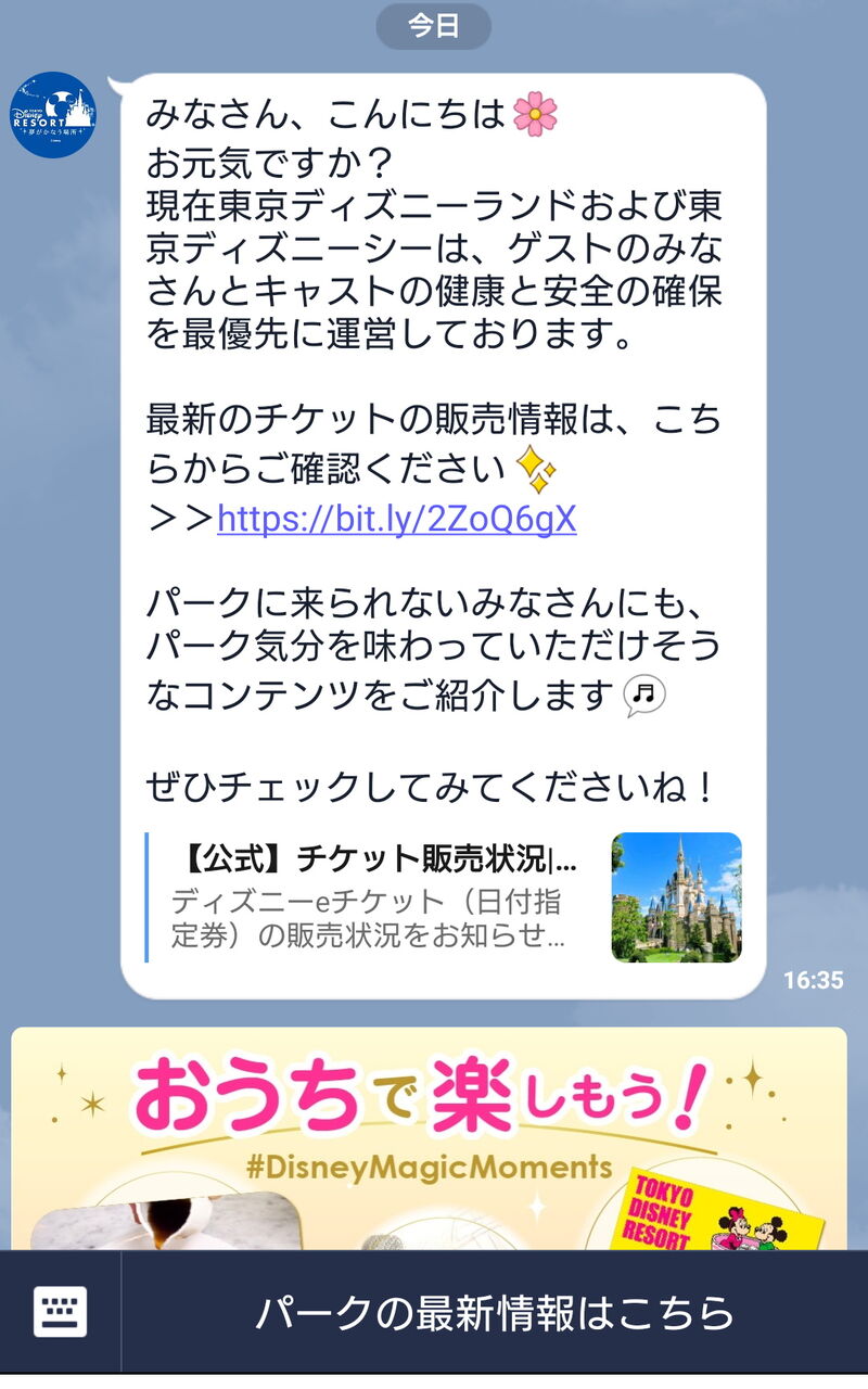 LINEお久しぶりの新着情報 東京ディズニーリゾート公式LINEからお知らせが届いた